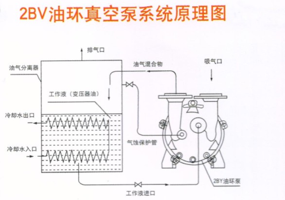 2BV系列油環式真空泵是在2BV系列水環式真空泵的基礎上,將工作液由原來的水改變為變壓器油。其極限真空度因油的飽和蒸汽壓較低而得到較高的提升,可達絕壓6.7mbar以下,甚至1.3mbar。而水環式真空泵因水的飽和蒸汽壓較高只能達到絕壓33mbar。在抽除污染較大的氣體及在某些特殊工作場合時,2BV系列油環真空泵的工作液也可用水或其它液體,因該泵為閉路循環系統,大大減小了對環境的污染,其極限真空度由工作液的飽和蒸汽壓決定。